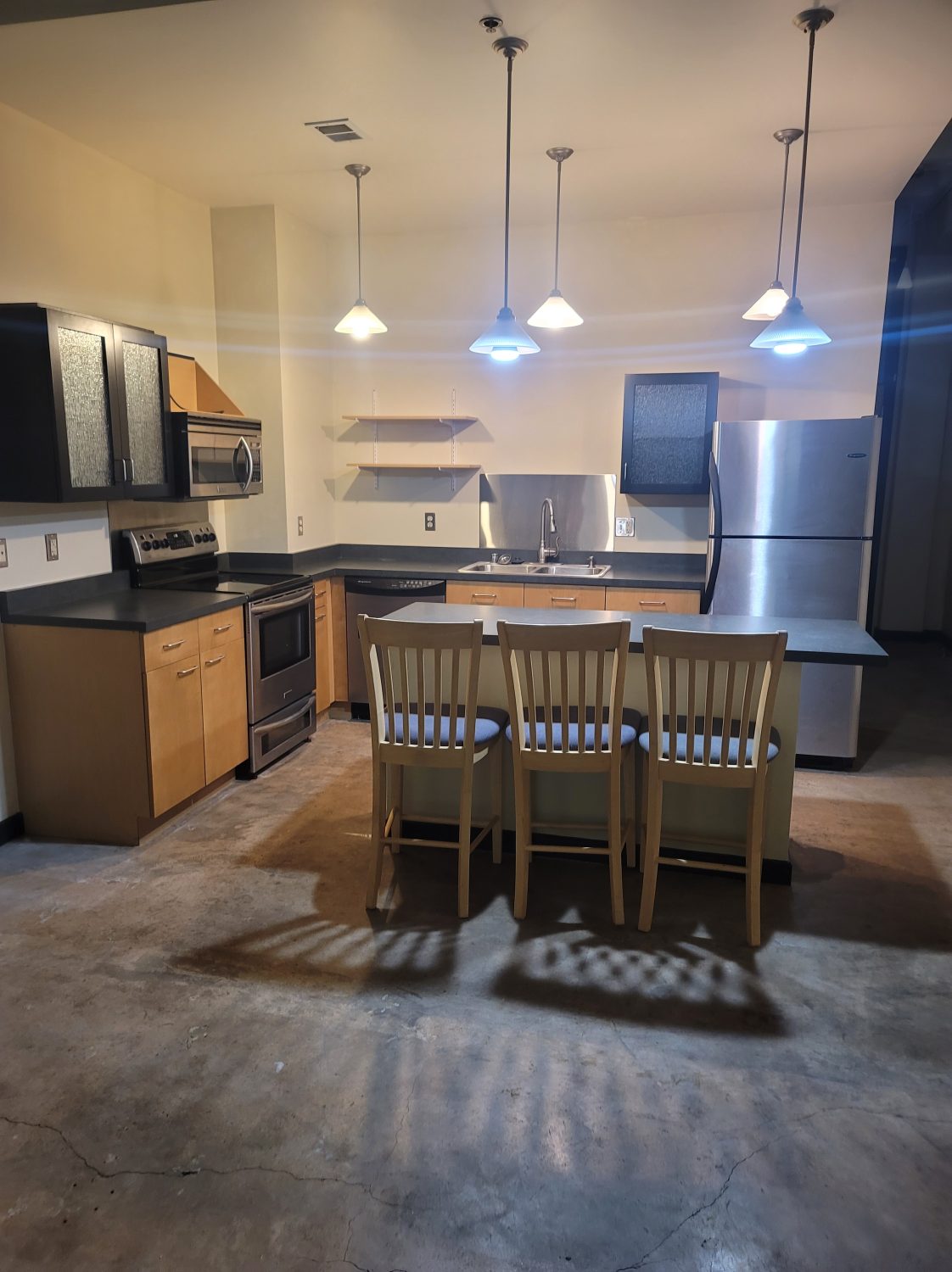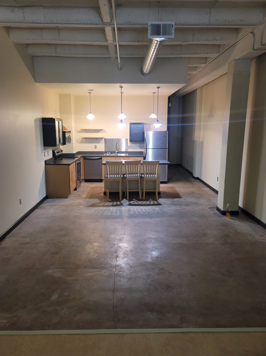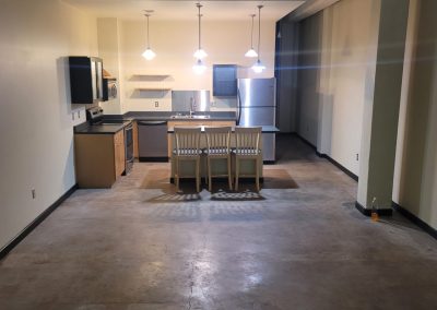 Approximately 752 square feet, this ground-level loft in the historic 1938-built Gymnasium building features east-facing operable windows, spacious island kitchen with stainless steel appliances (refrigerator, range/oven, dishwasher, microwave, disposal), full bath, concrete floors, contemporary lighting, accent walls and washer/dryer. Elevator/laundry/exercise equipment in building. Access to beautifully landscaped secure courtyard with grill, fountains, and seating/umbrellas.